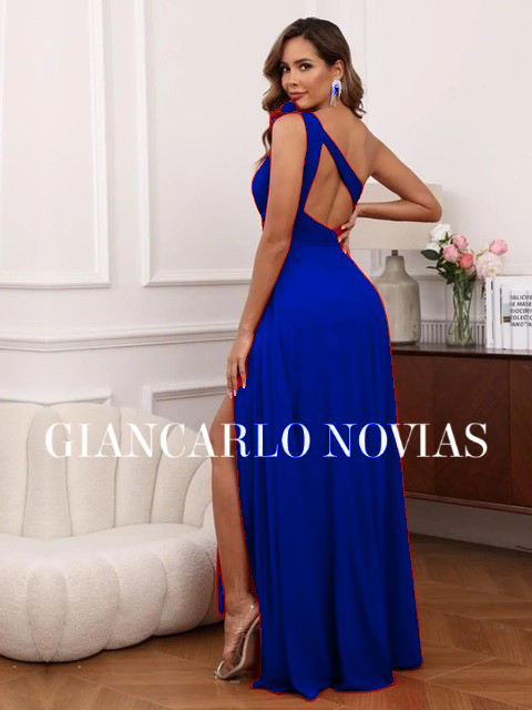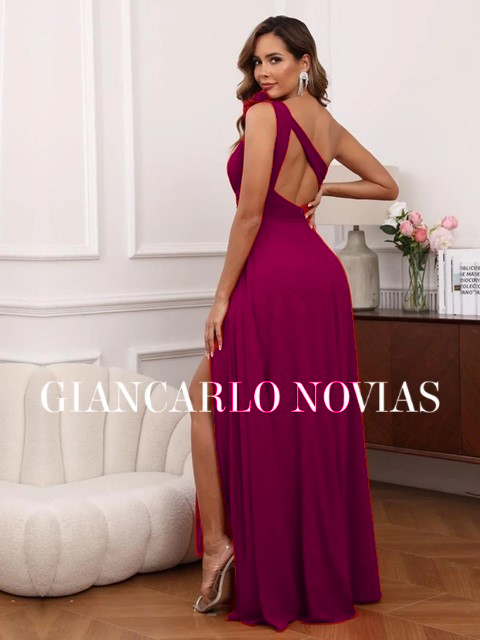 Vestido elegante y juvenil con escote asimetrico, espalda descubierta y raja en la falda, para lucir guapisima como invitada de boda o para el día de tu graduación.