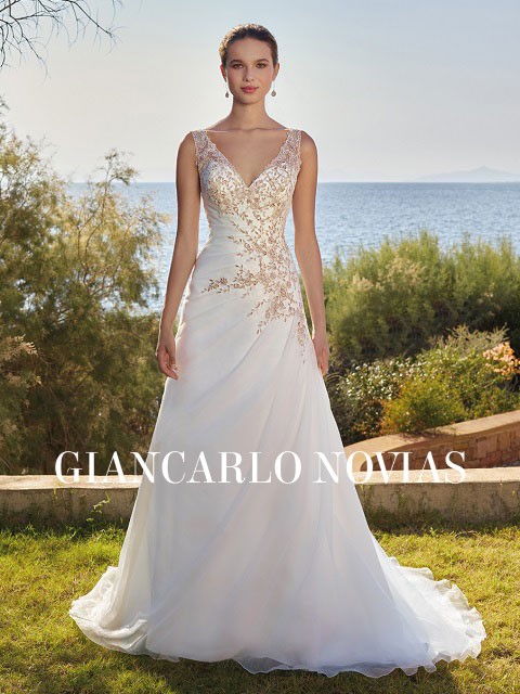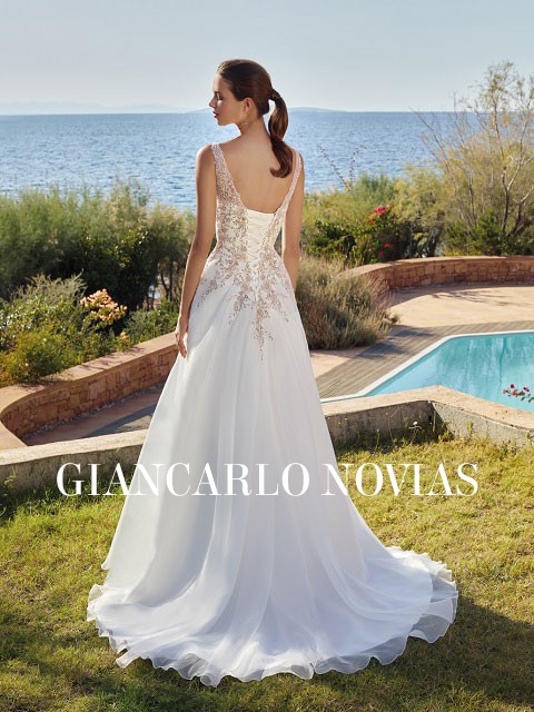 de novia sencillo de cote A con favorecedor escote de pico, espalda con